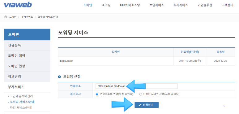 고정 포워딩 ( bigju.co.kr 연결 시 연결하는 https://autoss.modoo.at/ 주소가 아닌 bigju.co.kr 로 연결 )