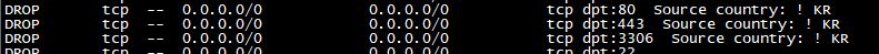 iptables -A INPUT -p tcp --dport 22 -m geoip ! --src-cc KR -j ACCEPT // 한구에서만 SSH 허용