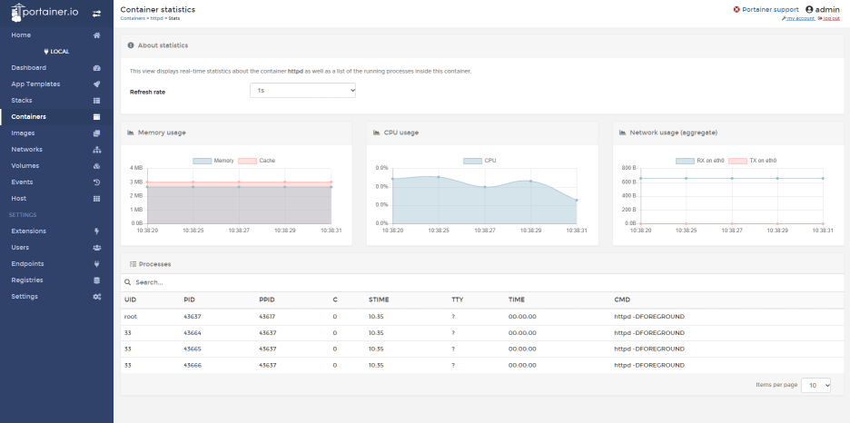 - 자원 사용량 (메모리, CPU, 네트워크 Input / Output) : 최소 5초 단위로 갱신