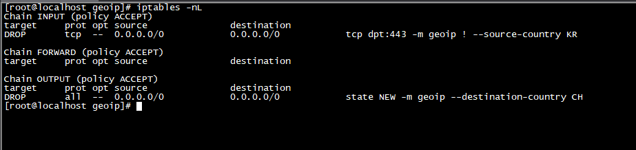 iptables -A OUTPUT -m state --state NEW -m geoip --dst-cc CH -j DROP // 중국에 대한 모든 접근 차단