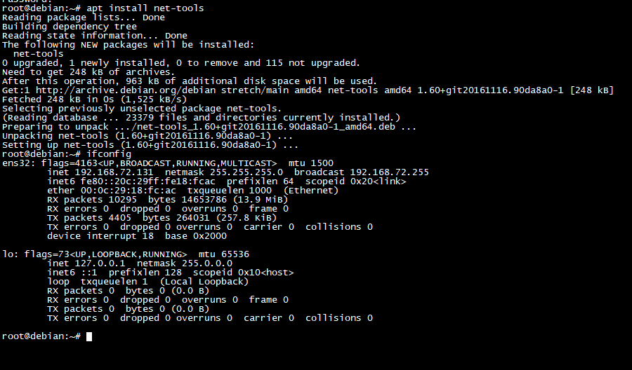 root@debian:~# apt install net-tools -y
