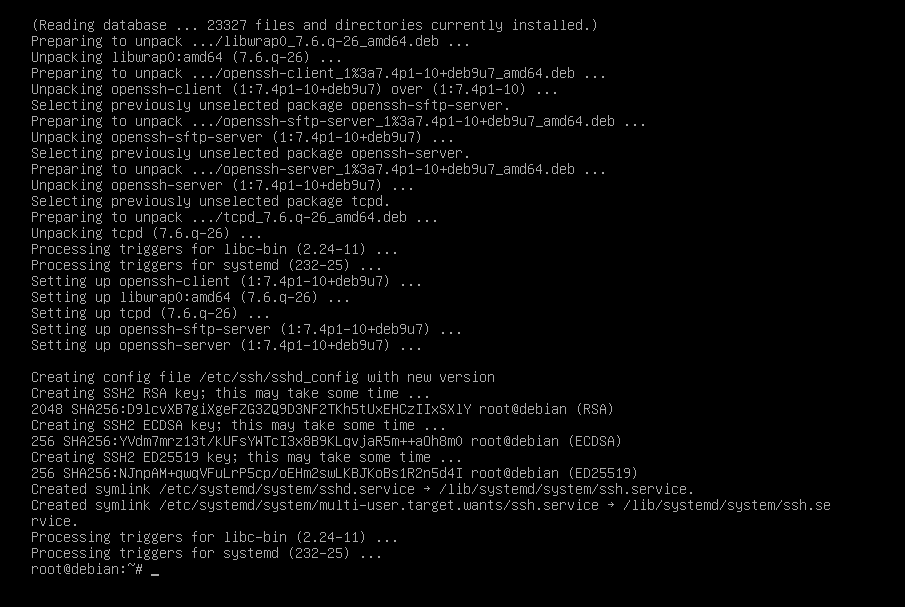 root@debian:~# apt install openssh-server -y