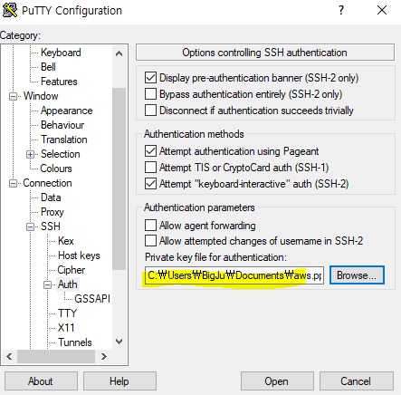 Connection ▶ SSH ▶ Auth ▶ Private Key file for authentication ▶ Browse 클릭