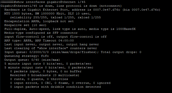 bigju# show interfaces gigabitEthernet 1/45 // 인터페이스 명 및 포트는 설정에 따라 다릅니다.