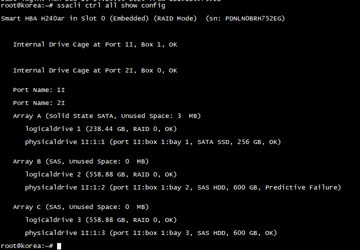 환경 :✅서버 : HP DL360 Gen9✅HDD : [0.1 Slot] SSD + [3 Slot] SAS 하드 -> 각 RAID 1, 0 설정 상태✅OS : Ubuntu 24.04 LTS📌상황 : 3 Slot 교체 RAID 0 1. ssacli를 위한 패키지 설치sudo apt updatesudo apt install alien libstdc++6 -y 2