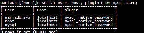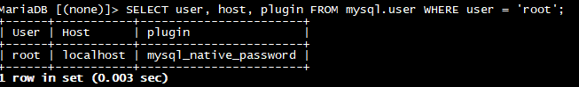 SELECT user, host, plugin FROM mysql.user WHERE user = 'root';