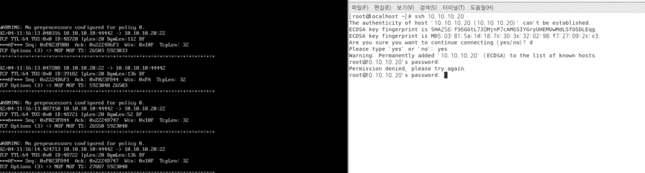 snort 서버에서 해당 포트 22번과 동시에 ip를 탐지합니다.